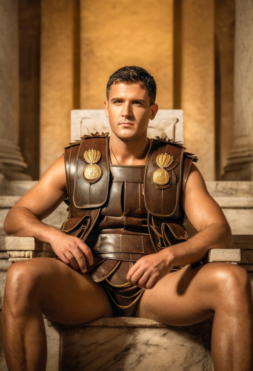 Create a stunning long shot image of a Roman emperor sitting on his throne, he wears a war vest and wears a laurel wreath. The image features soft, warm lights in late afternoon golden tones. The expression on his face should convey the depth and soul in his performance by drawing the viewer's attention to his powerful presence. In the blurred background, a Roman stone temple with large columns and some Roman senators on the stairs.