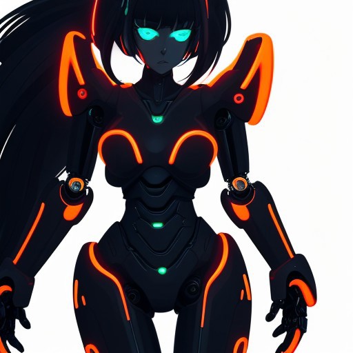 A neon robot girl. Anime style. White background. Neon. Black, red, Orange. Strong thick heavy fat black dark stroke lines. pronounced strokes. Dynamic.