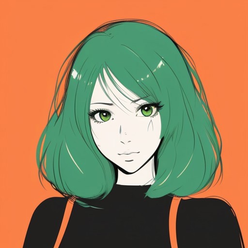 Girls. Anime style. Simple lines. Colors: Red, BLACK. Orange. Green. Colored background. Duotone. lines Colored. Heavy strokes. Thick strokes, thick lines. White background.