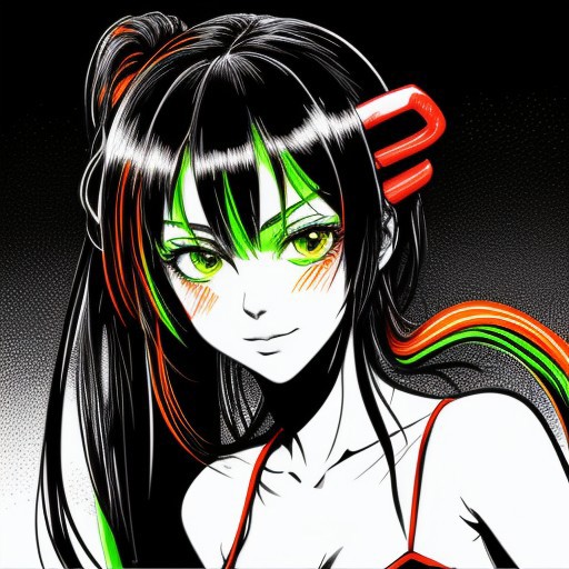 Girls. Anime style. Simple lines. Colors: Red, BLACK. Orange. Green. Colored background. Duotone. lines Colored. Heavy strokes. Thick strokes, thick lines. White background.