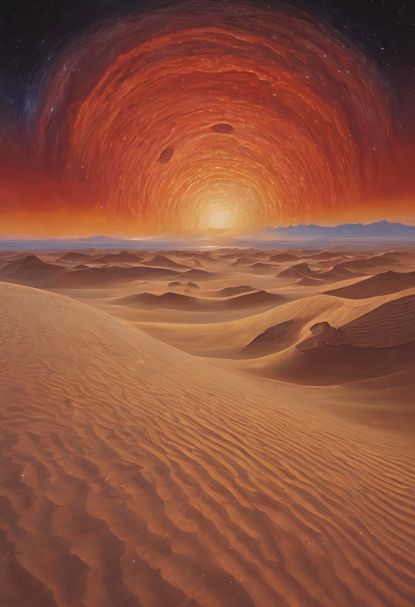 masterpiece, detailed landscape, An oil painting of an alien planet, A planet that is half desert and other half ocean, ocean, beach, vertical (place where sand meets the water in a very straight line), planet with crazy strong winds. red beam across the screen, Glowing different colors, strong sandy wind, sand is flying, strong water waves, wavy sand patterns, casting an otherworldly glow on the dunes landscape. dreamy landscape with scary shapes, burning hot landscape stretch towards the horizon, many stars are smeared across the sky, pulsing star patterns, almost symmetrical, glittering dust that shimmers like stardust. In the distance, in a distance sandy hills,