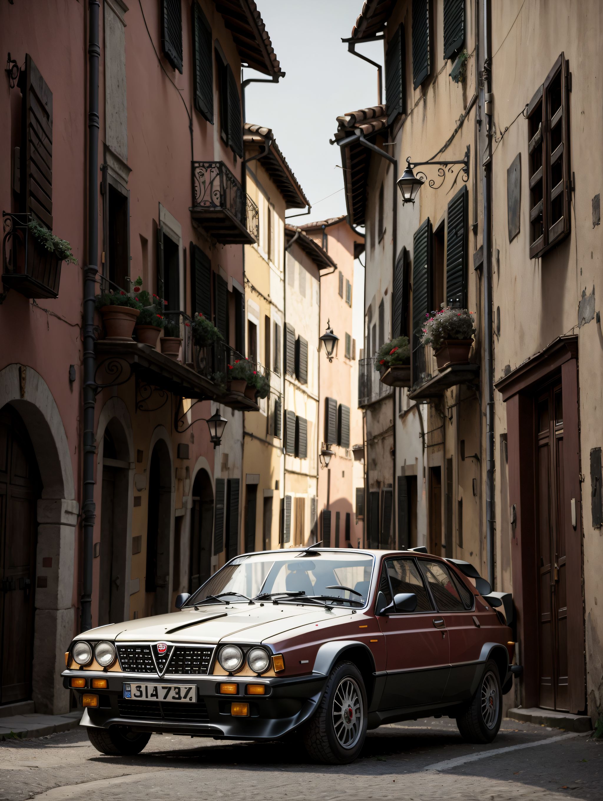 Italy, ((vintage rally car, lancia delta)), classic design, polished burgundy, roaring old-school engine, worn leather seats, winding roads through Tuscan hills, cyberpunk city