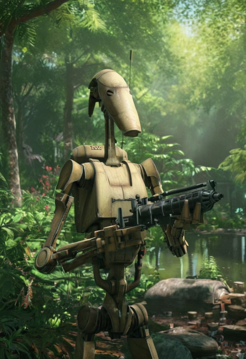 B1 droid holding gun in forest, realistic water effects, sun rays, realistic lighting, beautiful environment, shrubbery, reflections <lora:B1 Droid v1.0:1> <lora:add-detail-xl:0.5> <lora:xl_more_art-full_v1:0.3>
