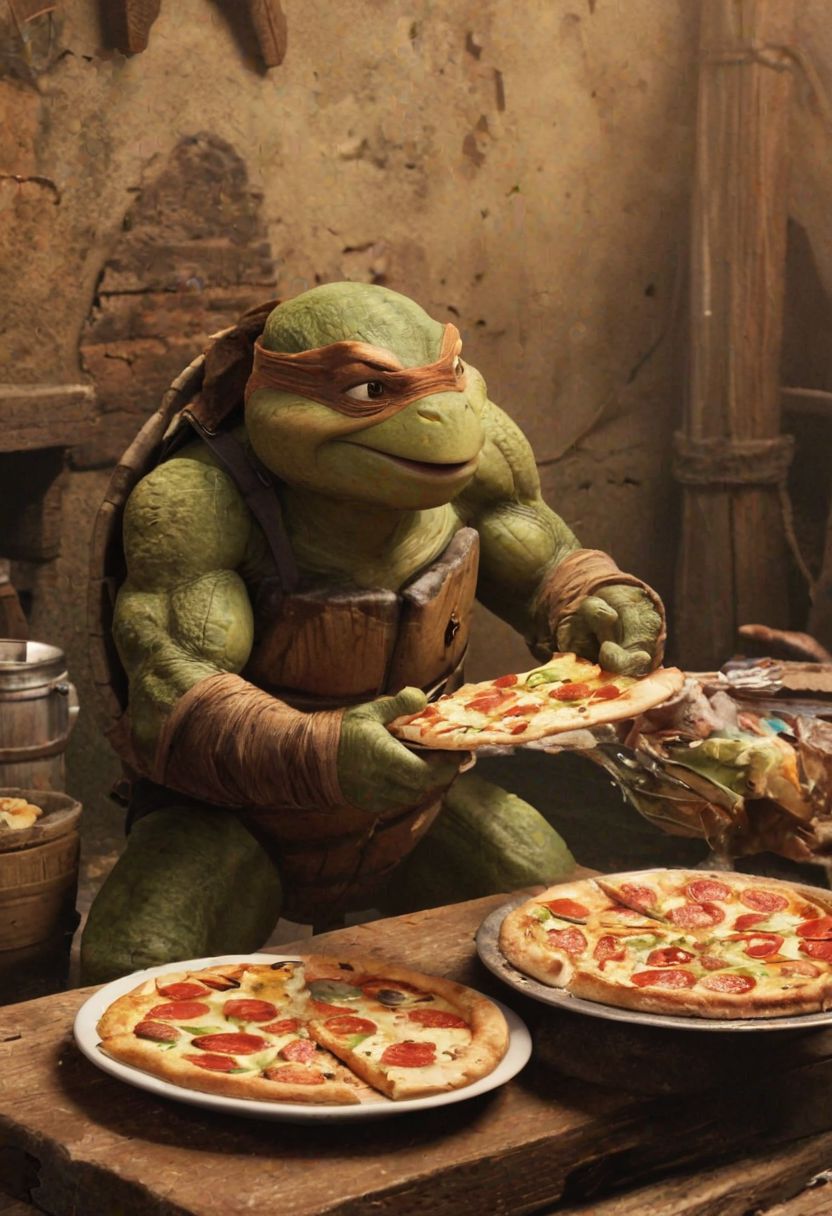 Michelangelo from the ninja turtles eating pizza and super excited, painting, in ninja turtle hideout