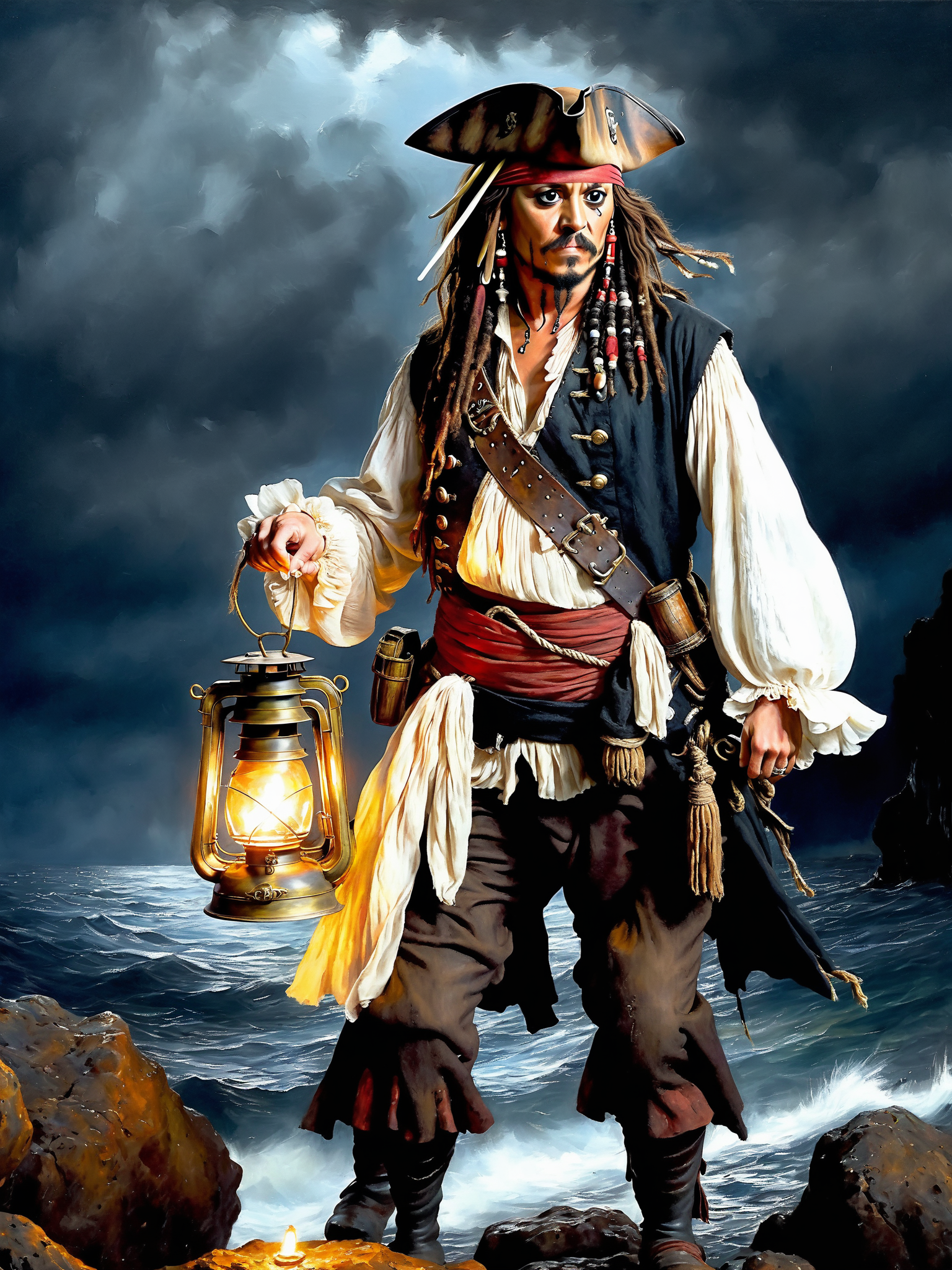 An oil painting , Capt. Jack sparrow standing on the rocky shoreline holding a lantern with his back to the camera as he watches his pirate ship sail away at night on the stormy seas <lora:PirateRealms:0.6> PiRe <lora:PirateRealms-10:0.8> PiRe <lora:jack_sparrow_offset:0.8> jack sparrow