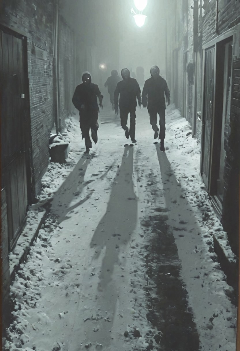 score_9, score_8_up, score_7_up, score_6_up, (realistic), CCTV Style, radiant darkness, black and white, static, BREAK, male, (((zombies))), female running away from zombies, panic, creepy, surrealism, fenliexl, BREAK, night, backyard, winter, darkness