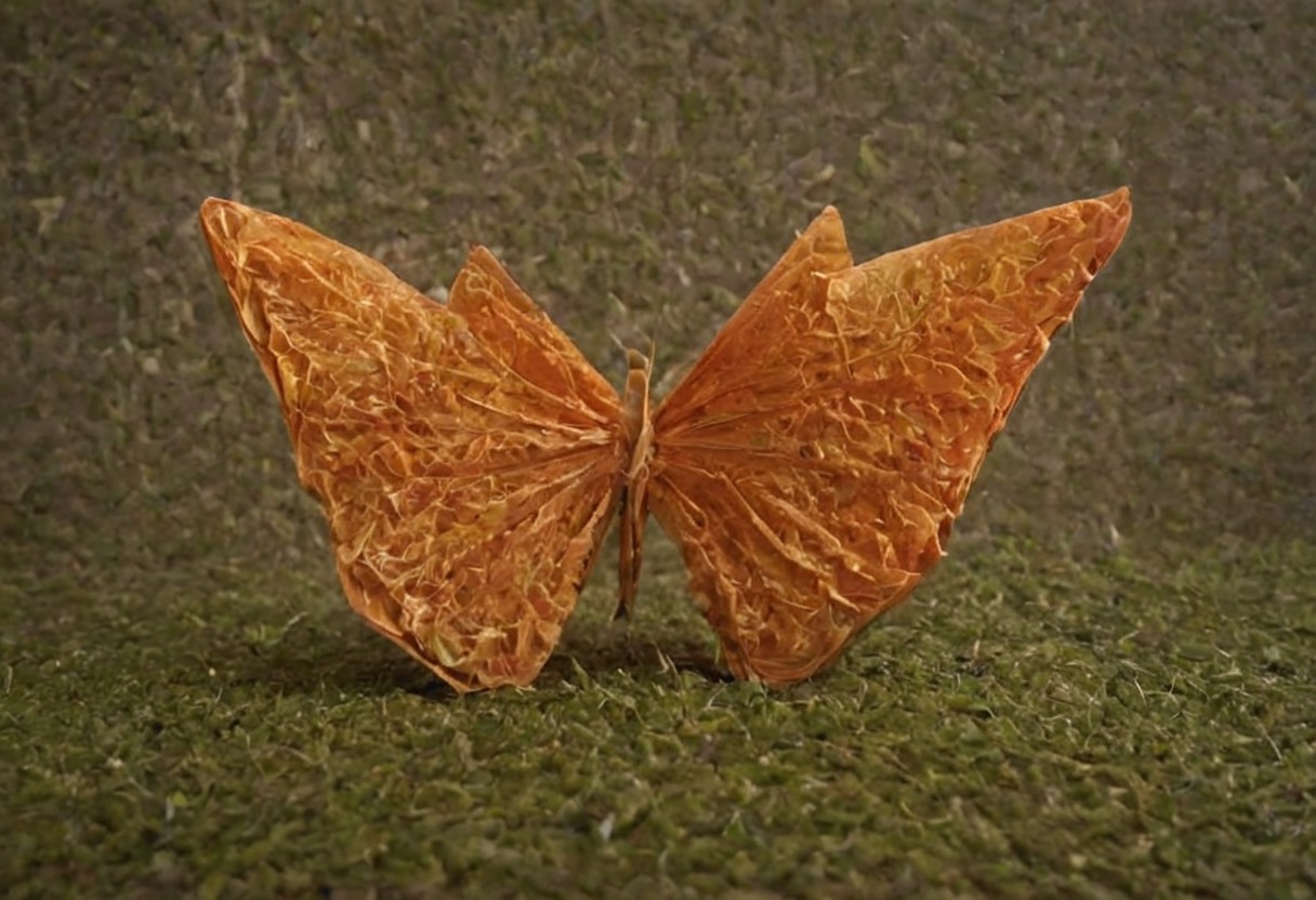 <lora:lcm-lora-sdxl:1>,<lora:add-detail-xl:1> A butterfly made entirely out of intricately folded origami red oranges, with wings detailed in varying shades of blood orange. The butterfly is flying gracefully in a lush, vibrant forest, where the trees and foliage are also made of perfectly folded origami red oranges. The scene exudes a sense of happiness and serenity, with sunlight filtering through the orange paper leaves, casting warm, orange-tinted glows on the ground. The intricate details of the origami folds are clearly visible, adding texture and depth to both the butterfly and the forest environment. Origami, made of orange,, made of blood_orange,