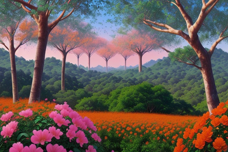 ((overlooking an exotic alien landscape)), ((jungle with trees that have blue leaves)), ((trees have only blue leaves)), jungle landscape with blue trees, (((on top of trees are orange flowers))), ((blue leaves tree tops have orange flowers)), ((((pink hanging flowers on the tree))))