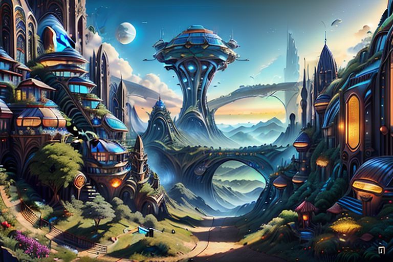 solarpunkai, green-powered, DonMASKTex, Led, advanced alien technology, alienarchitecture, an ancient city, at a huge valley, 3 layers city, middle of the city is a skyscraper surrounded by castle, behind the ocean, soothing scenery, spring season, flying ships, futuristic intricate mechanical details, ground level shot, 8K resolution, Cinema 4D, Behance HD, polished metal, Unreal Engine 5, re
