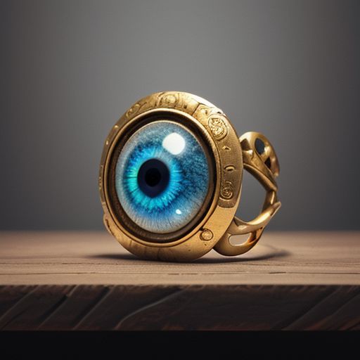 A Golden ring with a blue eye on it lying on a wooden table , Fantasy , Meadieveal ,digital art , oil painting