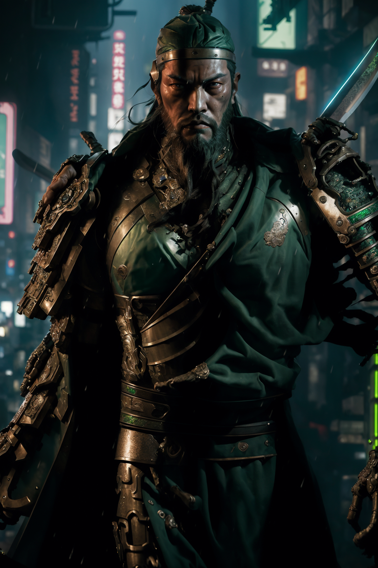 (((cyberpunk))),<lora:guanyu_8:0.8>,guanyu,((green armor)),long heavy beards,(((long handle blade))),prosthesis,rain,city,(mechanics:1.4),close-up,glaring,serious,highres,submissively,(((make an obeisan))),