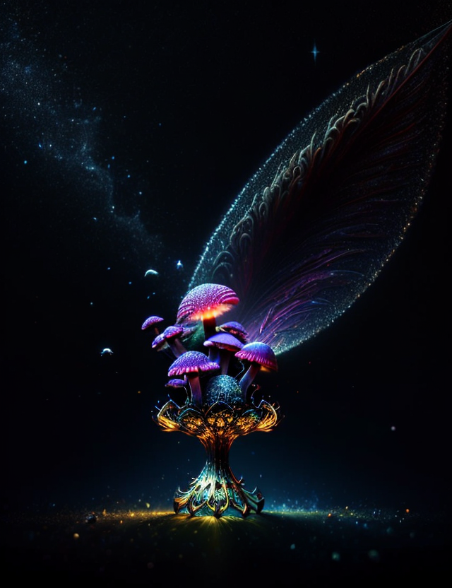 ((best quality)), ((masterpiece)), ((realistic,digital art)), (hyper detailed),DonMF41ryW1ng5 Dark Spore Print Dainty Cup-shaped Rough mushroom, Satin, Scaled, Beneficial Interaction, Gorge, Stellate, Emitting light, Remnant Annulus, Noxious fumes, , octane rendering, raytracing, volumetric lighting, Backlit,Rim Lighting, 8K, HDR, <lora:DonMF41ryW1ng5:1>