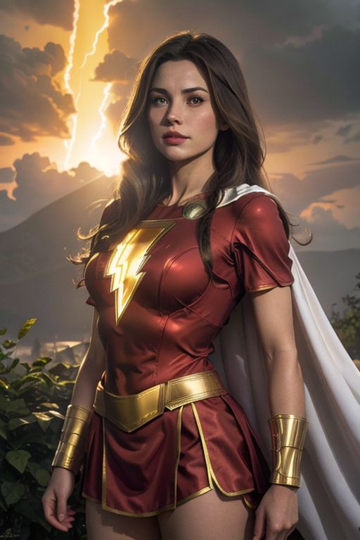 masterpiece, best quality,high quality, mary marvel, white cape, red dress, red skirt, short sleeves, bracer, glowing shest logo, proud, (heroic pose), godly light, thunder, lightning