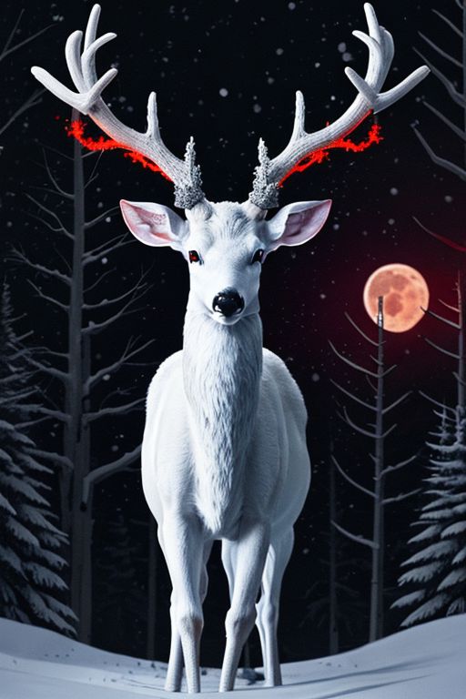 a angry white deer with huge antlers, with glowing red eyes, stands against the backdrop of a bloody moon in a snowy forest, in the dark
