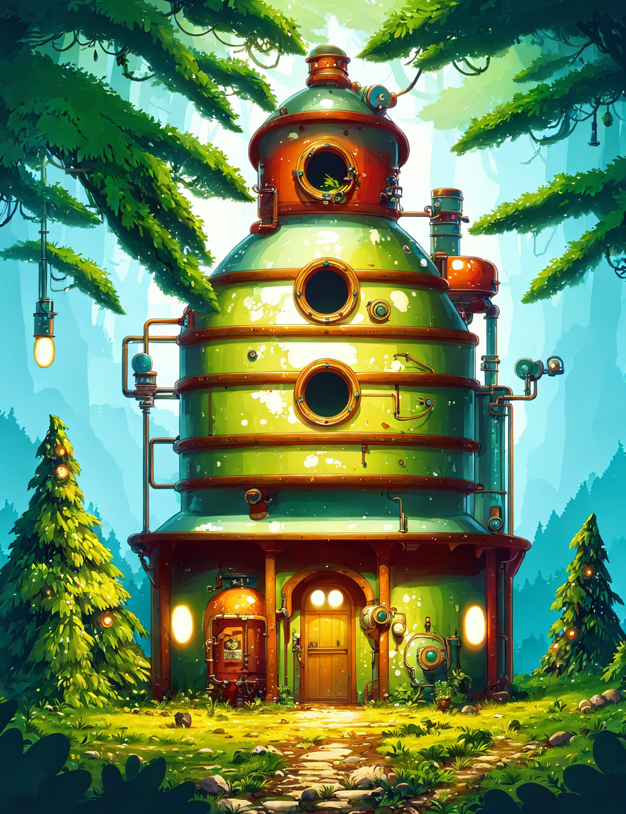 masterpiece, awesome quality, hyper detailed, DonMCu73T00n, ghibli ,cute, distillery in boreal forest biome, <lora:DonMCu73T00n:0.8>