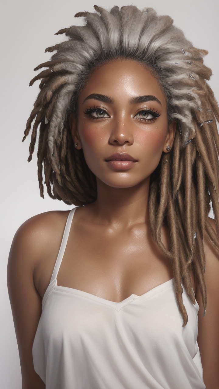 OverallDetail, SkinHairDetail, EyeDetail, fFaceDetail, HairDetail, SkinDetail, 2d artwork, (3/4 view), (upper body:1.5), 1girl, casual wear, street, (from below:1.2), vintage, (dreadlocks), grey hair, futuristic background, hands off screen,<lora:Akira Raikou [MockAi - v1.0]:1>