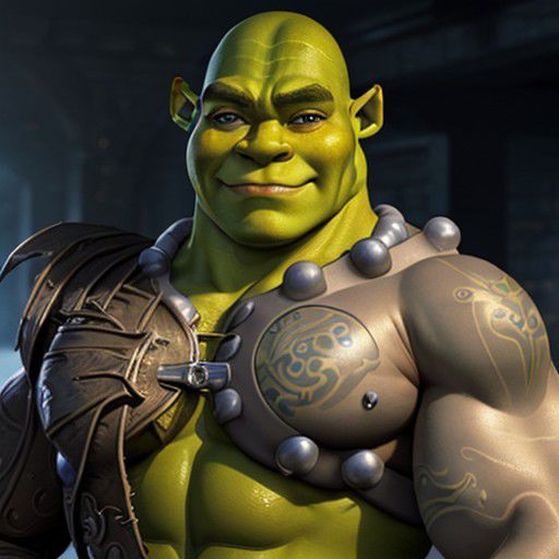 ((Muscular shrek/cyborg with tattoos)), black hair, (blue eyes), chiseled face, big shoulders, cyborg biceps and arms, tough chest, perfect abs, realistic skin, perfect pixels, super detailed, 8k, ultra high definition, cinematic style, exceptional visuals,