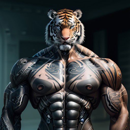 ((Muscular Tiger/cyborg with tattoos)), black hair, (blue eyes), chiseled face, big shoulders, cyborg biceps and arms, tough chest, perfect abs, realistic skin, perfect pixels, super detailed, 8k, ultra high definition, cinematic style, exceptional visuals,