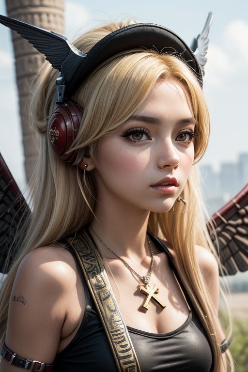 , solo, portrait of goodisis, goodnes ornate, egypt, energy, aura, dust, debris, Face looking, tanned skin, women, Ankh Cross, wings, ankh, Black Eyeliner Ariana Grande-Butera blond clothing wet transparent white silk -red army - dark elf lineage 2 - cyber punk