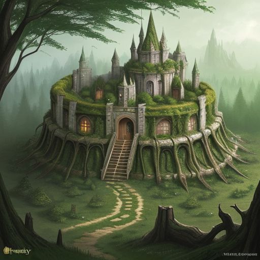 Fantasy elven ruined fort, forest setting.