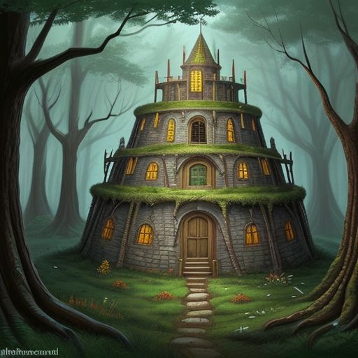 Fantasy elven ruined fort, forest setting.