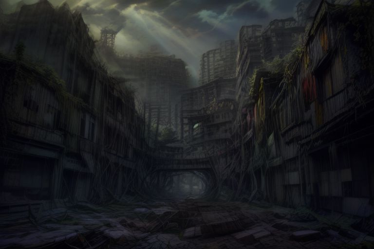A decayed ruined abandoned city full of decrepit concrete structures hollowed out by the ravages of time slowly being enveloped and overgrown by verdant foilage with grass, vines and trees cracking the remains of pavement and growing through gaps in the masonry, post apocalyptic
