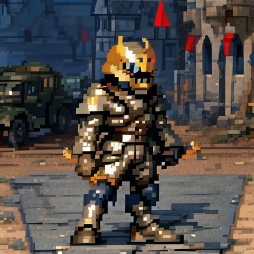 absurdres, highres, 31bits, PixelArt, pixel, side view, mecha, ZeonMS1:0.1, one-eyed, (((ww2 german helmet, ww1 german helmet))), military helmet, stahlhelm, massive helmet, hp bar, full body, holding machine gun, holding sword