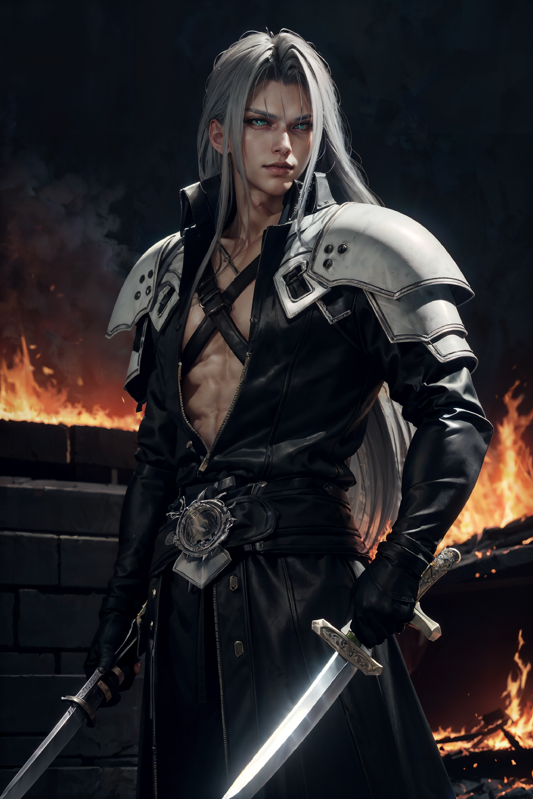 (masterpiece, best quality), intricate details, 1boy, standing, (looking at viewer), Sephiroth \(Final Fantasy\), Sephiroth, (holding sword in left hand:1.5), (green glowing mako eyes), dark theme, village, (fire scene:1.4), (fire:1.4), (conflagration:1.3), professional lighting, photon mapping, physically-based rendering, grey hair, weapon, sword, gloves, long sleeves, parted bangs, black gloves, chest strap, holding weapon, <lora:sephy:0.8>, <lora:LowRA:0.6>
