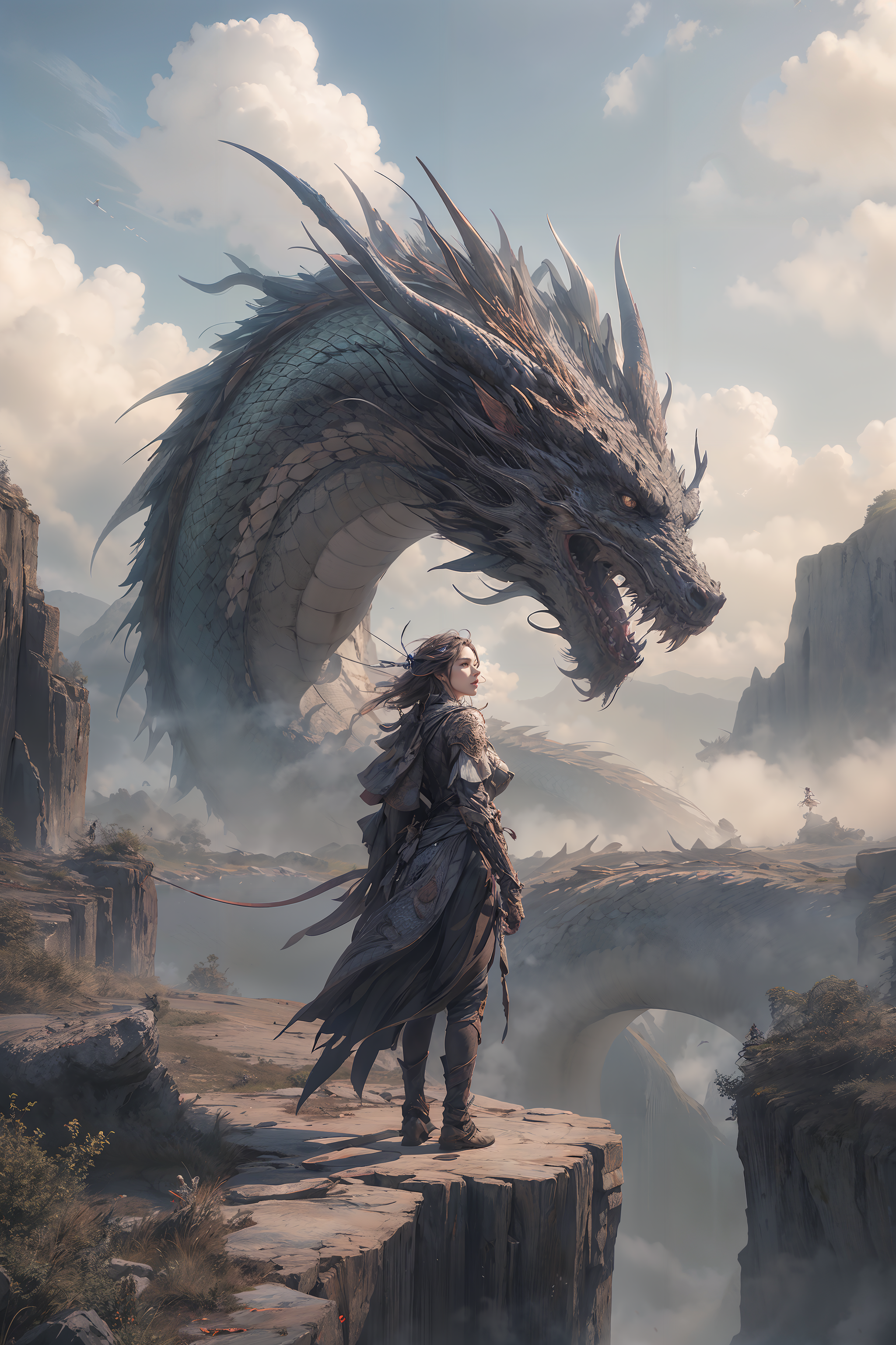 girl holding a bow standing on a cliff,majestic dragon,detailed dragon scales,sky,ultra realistic,concept art,intricate details,highly detailed,8k,sharp focus,volumetric lighting,<lora:ChineseDragon_v2:0.7>,