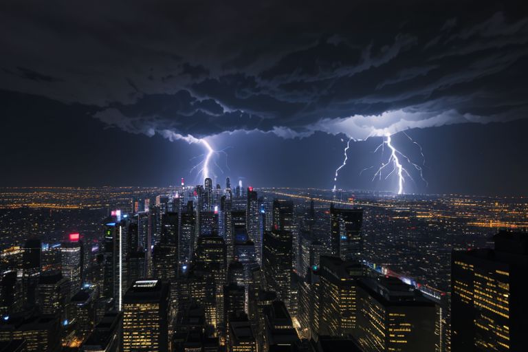 A large city, it's night time, its raining very heavily, there's a thunder storm and lightning striking the top of one of the skyscrapers
