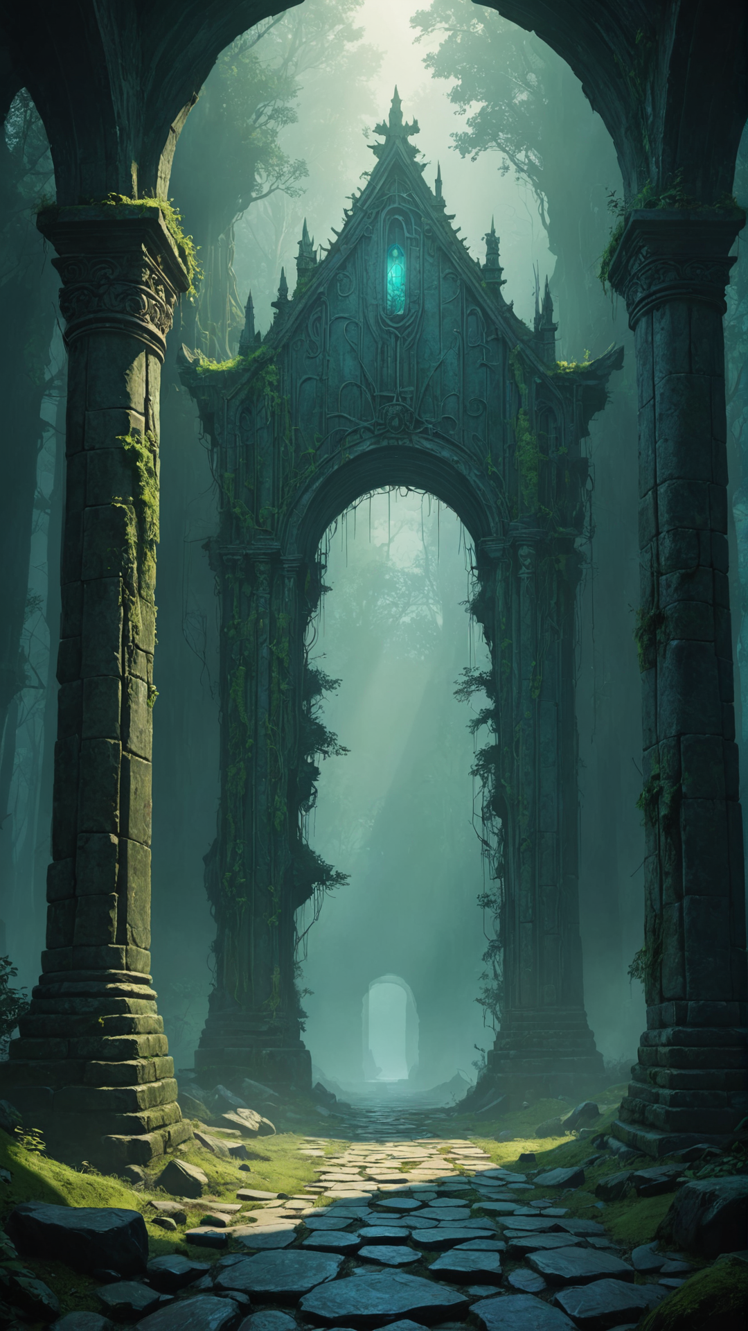 myst,Objective abstraction,ancient nordic architecture,atmospheric,moody lighting,blue and green color palette, stylized texture,digital art,concept illustration,vertical orientation,