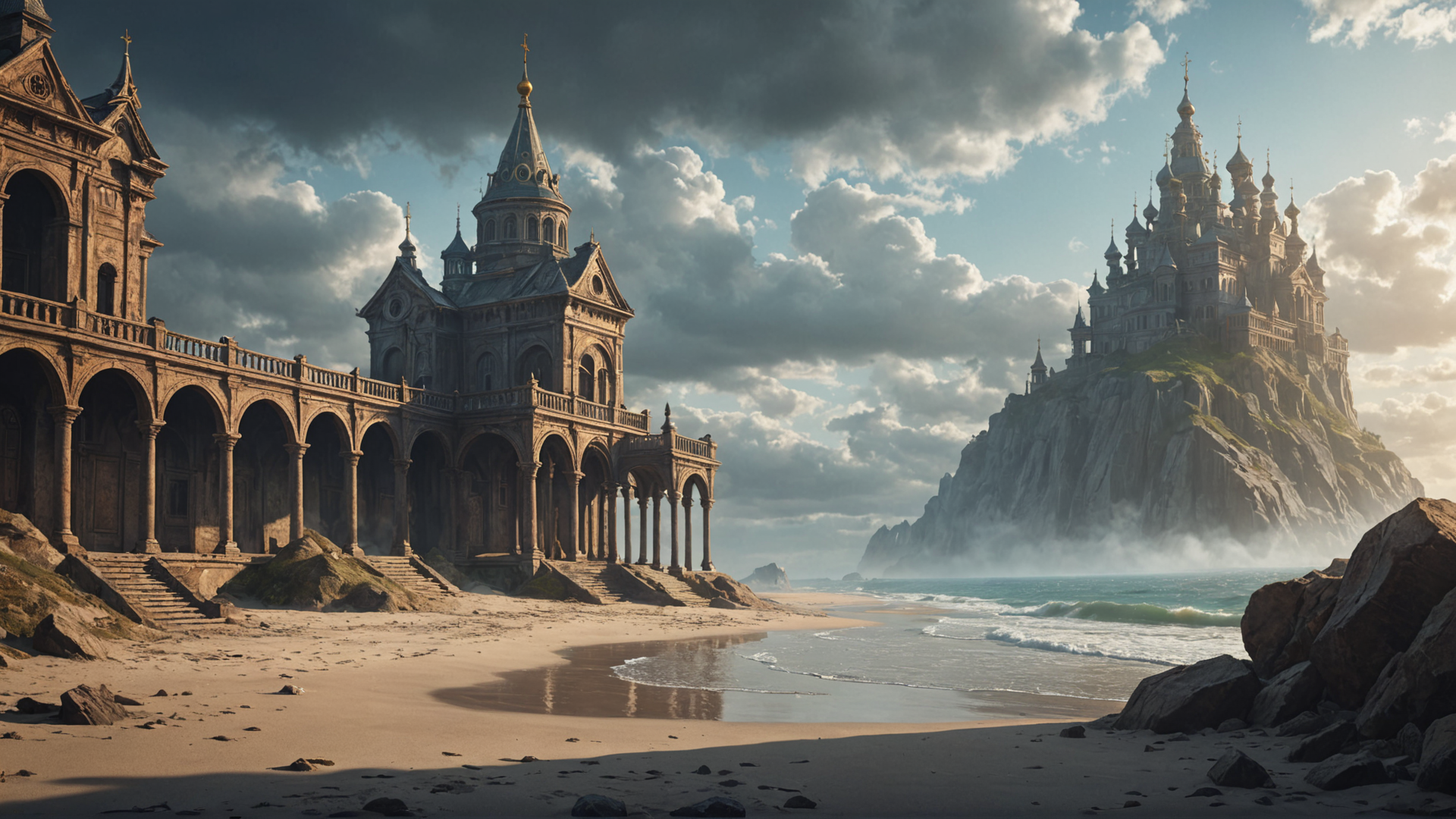 myst,Objective abstraction,ancient russian architecture,atmospheric, cinematic lighting,beach stylized texture,digital art,concept illustration,horizontal orientation,