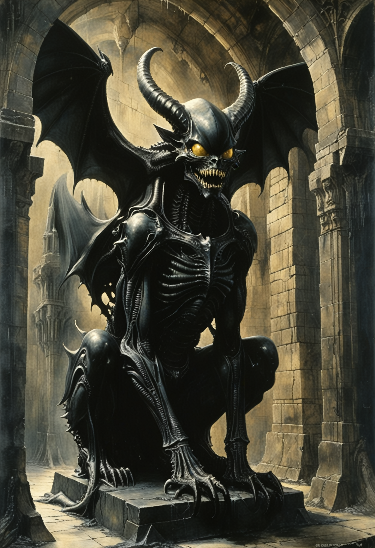 masterpiece, best quality, <lora:tbh295-sdxl:0.8>, illustration, style of H. R. Giger, (fearsome marble blue moss-covered stone gargoyle) with humanoid body , large bat-like wings, hazel eyes, short horns, claws,runic engravings, set in a dark castle parapet, with shadowy alcoves, fluttering bats, an ominous ambiance, at dusk