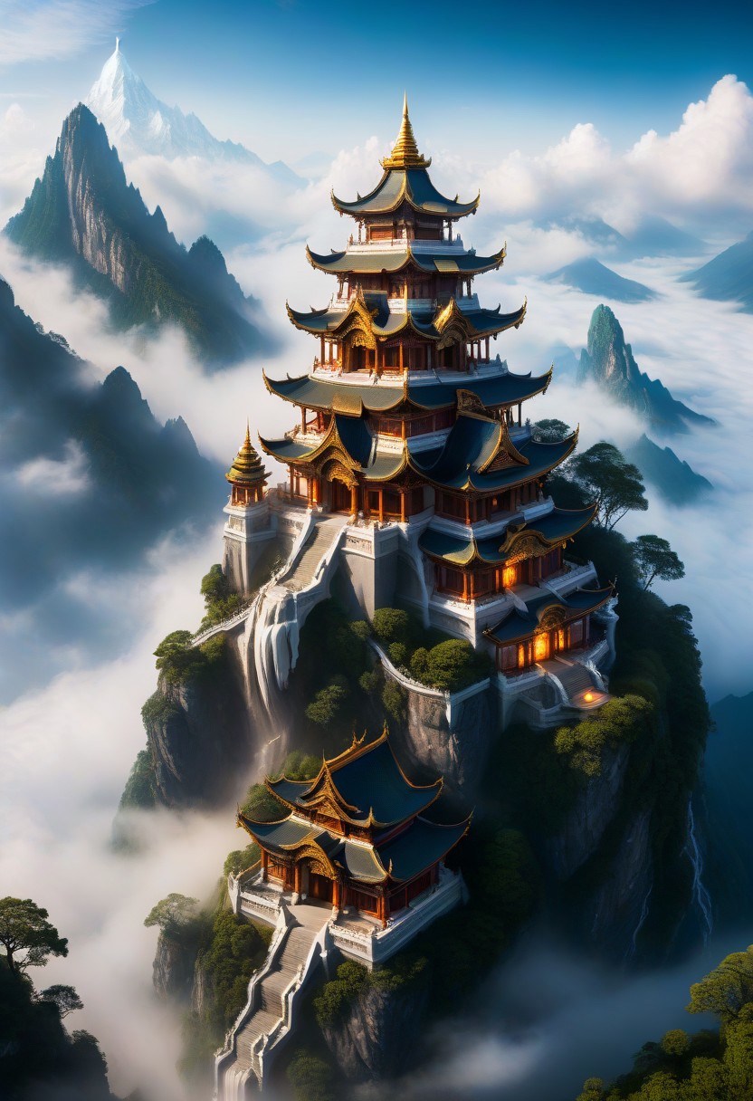 Mystical Mountain Temple: A majestic temple perched on a misty mountain peak, surrounded by swirling clouds and illuminated by ethereal light. The temple features ornate architecture, glowing runes, and a tranquil, otherworldly environment.