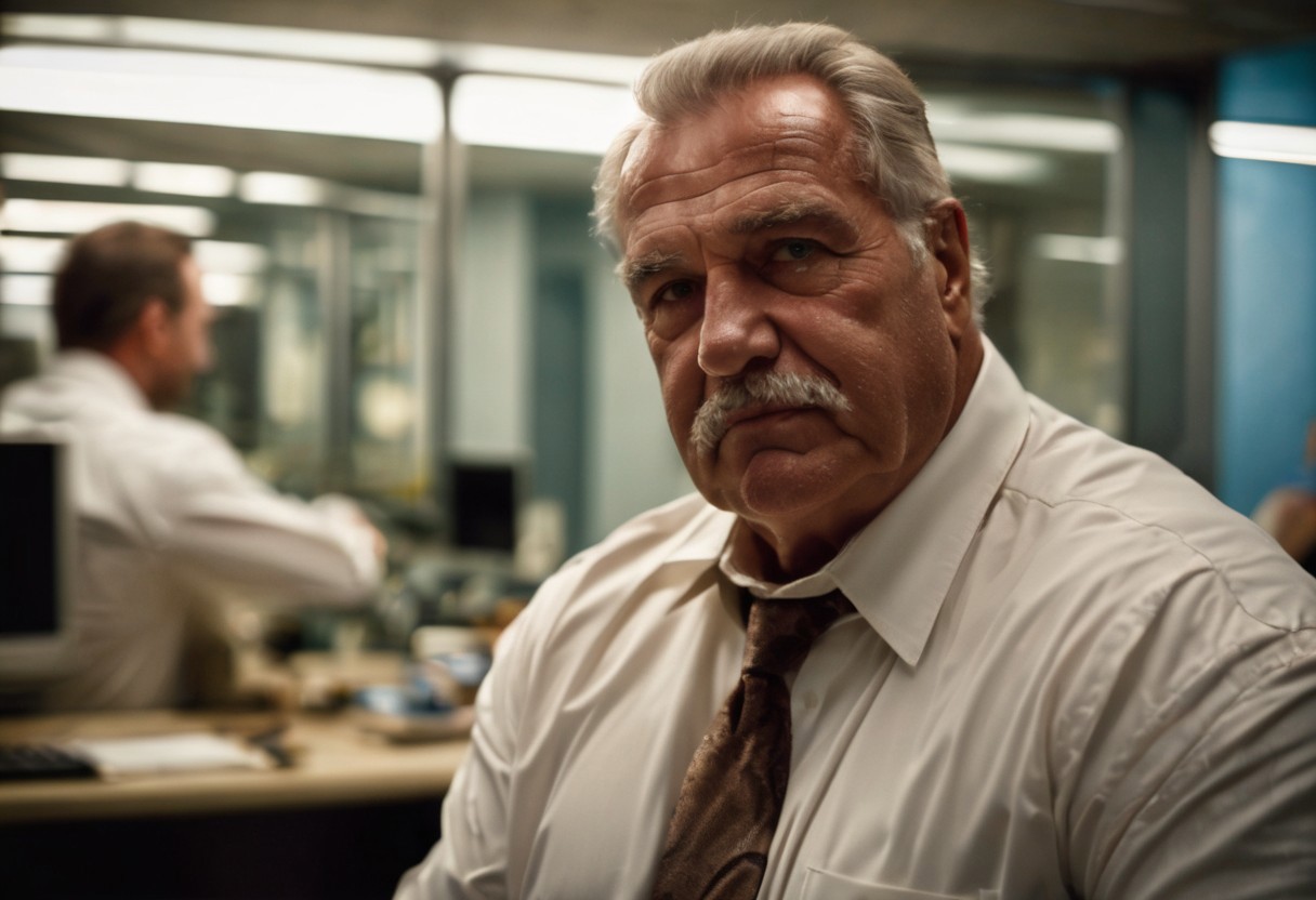 romantic flirty expression, intimate, cinematic hazey atmosphere, photograph, romantic movie scene, old mature man, old musclechub daddy, tanned skin, doublechin, handsome chubby old face, gentle smile, white latex undershirt muslceshirt tanktop, in a dark office at night, nighttime, dim, adventurer, archeologist, brute, wise, barbarian, berserker, leader, boss, ((flexing his massive biceps, tanned old bodybuilder))