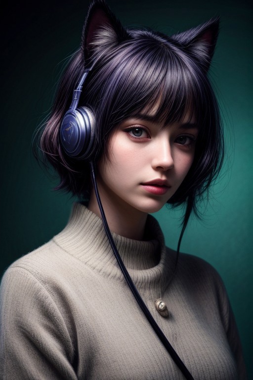 (masterpiece, best quality, highres:1.2), raw portrait photo of Girl with headphones, cat ear headphones, colored hair, in high detailed textured, (most iconic photo), (dynamic background), depth of field, morbid, dynamic time, (light smile:0.3), SFW,