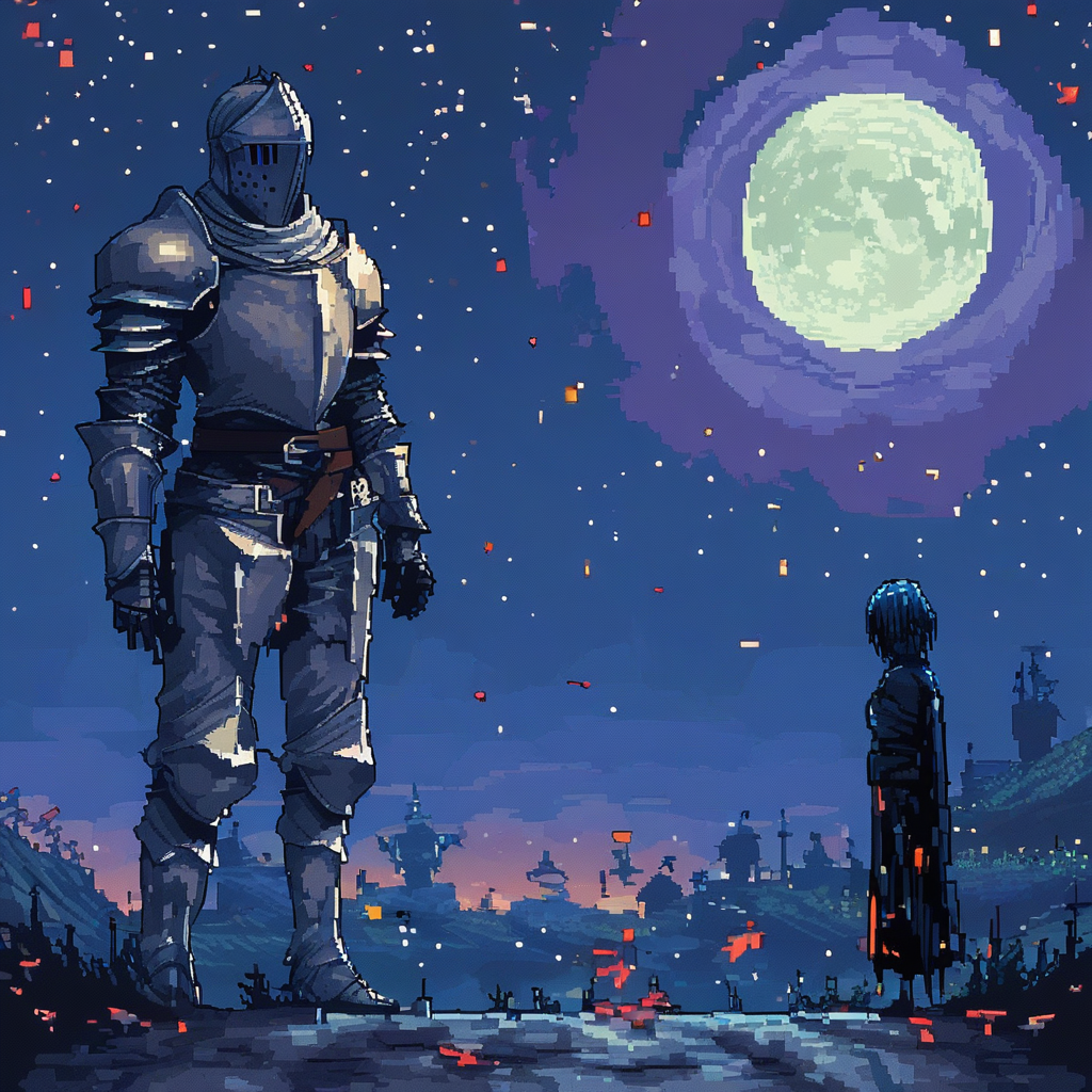 Pixel Art , fewP, Knight, night, dark fantasy background, 8bit, pixelated, one man, <lora:ArsMJStylePony_-_Pixel_Art-000004:1>