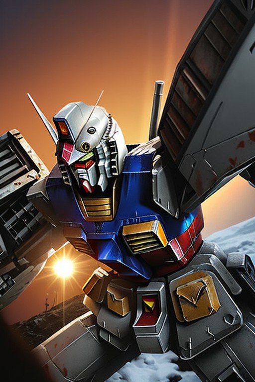 (masterpiece:1.2), (photo of a partially buried rx78, sandblasted and rusted, their robotic arm reaching towards a flickering sun Emphasizing the harsh environment, with cracked lenses and fading paint details:1.1), (bathed in the cold light of a holographic moon:1.1), (art by Cyril Rolando:1.4), (close-up shot:1.0), (hyperdetailed:1.1), (intricate details:1.0), (Refined details:1.1), (best quality:1.1), (high resolution:1.2), rx78,