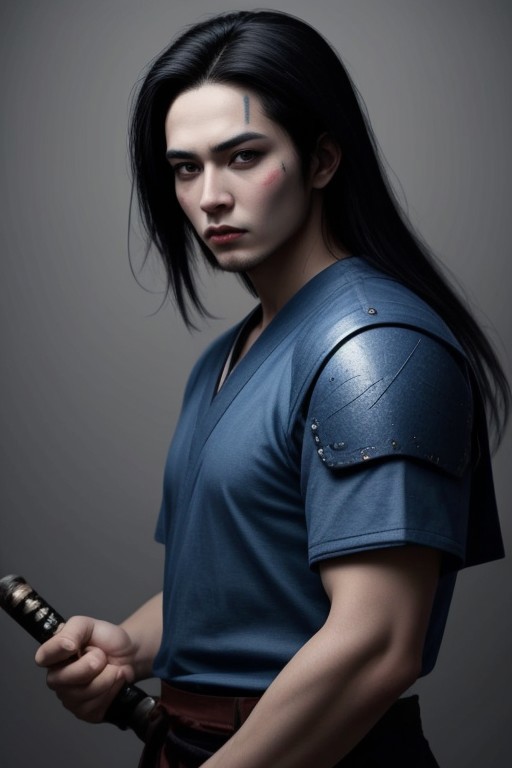 masakado: Male, with long straight black hair, bald forehead and head, blue skin, very strong build, Japanese Kabuki Sujikuma makeup on his face, expressionless, wearing a full set of gorgeous blue Japanese samurai armor, and holding a katana in his right hand. FHD, masterpiece, realistic style.