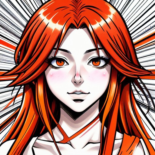 Anime style. Redhead. Esoteric art. Fast straight lines. Rushed lines. Strong stroke. Red and Orange stroke lines.