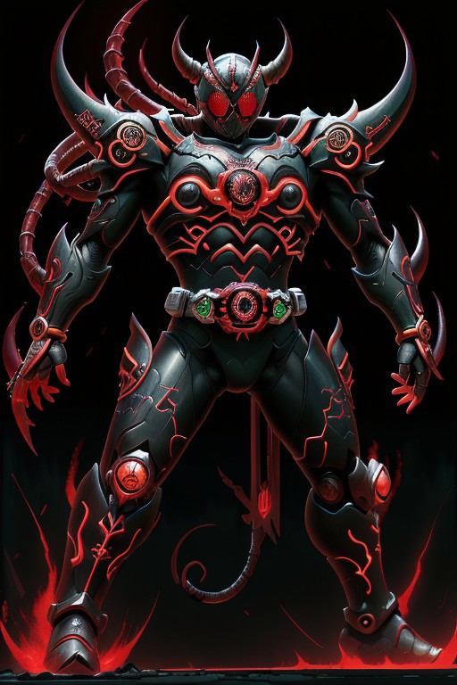 Kamen Rider, Demon, full body, Toei Company, Ishimori Productions, dynamic pose, kamen rider pose, hero pose, 4K, high resolution, Precise details, cinematic lighting, Unified shadow and light, mood lighting, dynamic lighting, physically-based rendering, Professional, 2D, 2D art, pixiv, ultra-fine painting, Painting, Graphic, Japanese style, anime art, Japanese comics, Japanese manga, illustration, vivid color, anime art style, masterpiece, high-quality, best quality, hyper quality, high detail, hyper-detailed, full details, extreme detail description, full-picture, scifi, demonictech
