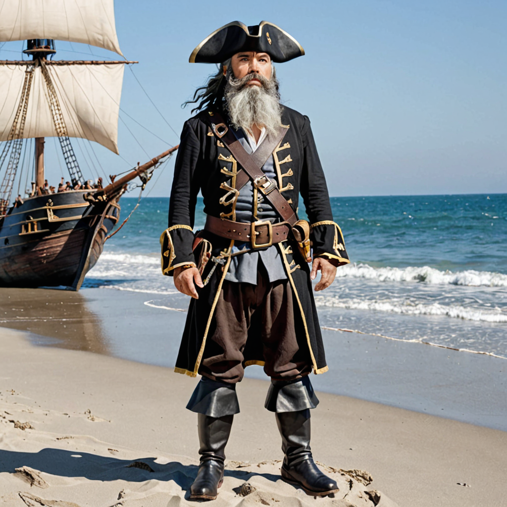Dwarf, male, captain, long beard, black hair, gray hair, brown eyes, triangle, standing on beach, ship in back photo, black pirate costume, triangle, full height