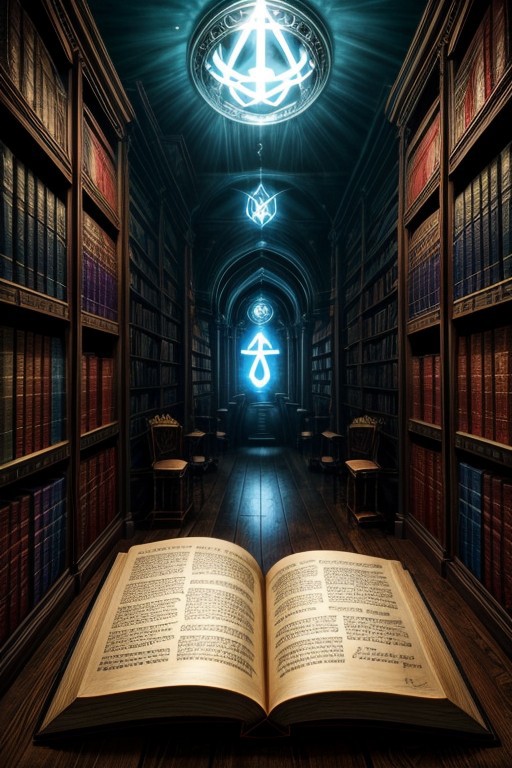 masterpiece, best quality, absurdres, illustration, photorealistic, cinematic, dynamic, domain expansion, floating books, glowing runes, endless shelves, ancient tomes, arcane symbols, dim light