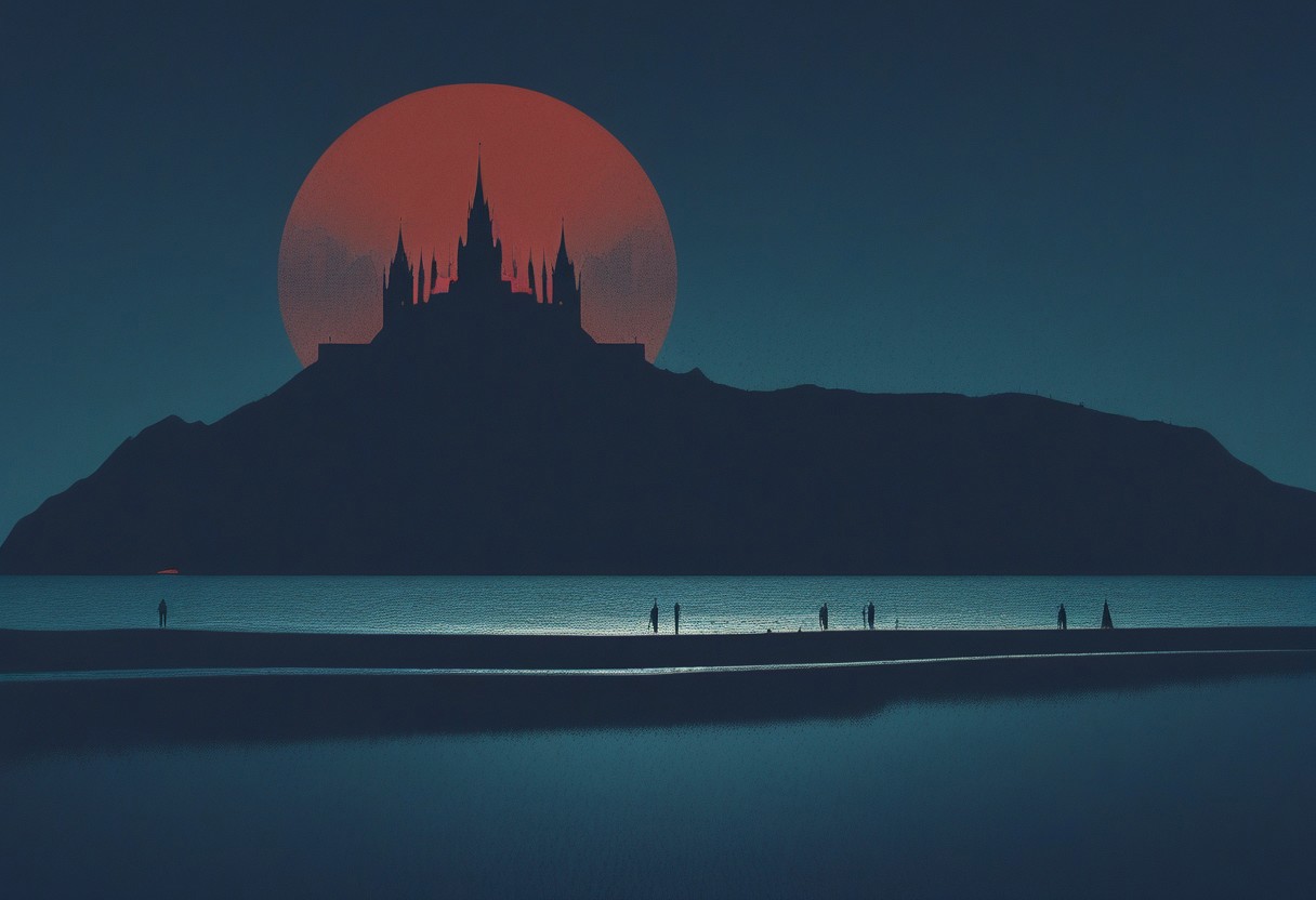 busy and crowded ancient city that slops towards a protected port, witches watching a small partialy obscured bright solid red featureless orb drop from the sky into the ocean in front of the city, creating a large ripple, huge dark orange clouds in distance, novuschroma28 style, reflective water, DnD_Grainyboyz