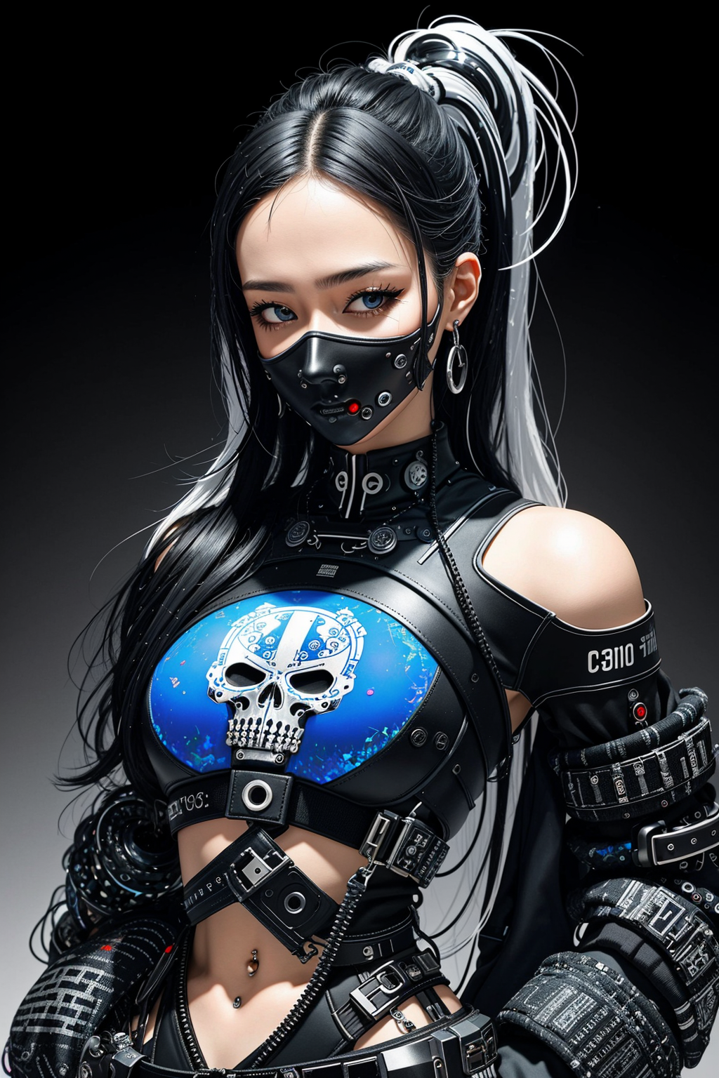 (Cybernetic Abstract: abstract tech patterns, digital chaos, algorithmic art), <lora:edgGrungeFreestyle:1>, <lora:epiNoiseoffset_v2-pynoise:1>, 21 year old woman, punisher skull, provocative pose, wearing detailed psychadelic mask, in style of Tibetan Blue and Opal, psychedelic, black and white, illustrated by Stanley Artgerm, artstation