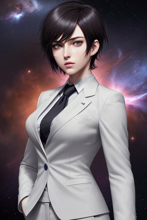 Upscale from Civitai Generator, anime girl with short hair, sharp eyes, supernova background in space, wearing a suit Hugo Boss fancy one, eyes that can pierce the heart of any man, very formal appearence.