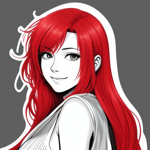 Anime style Redhead Girl smirking. white background. Black and white red only. Strong dark thick lines. Heavy strokes.