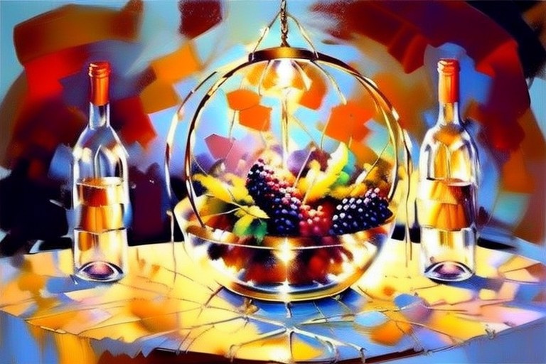<lora:impasto painting:1> fruit basket, grapes, round table, drapery, wine bottle, beautiful lighting, zoom in, close up, painting bursh work