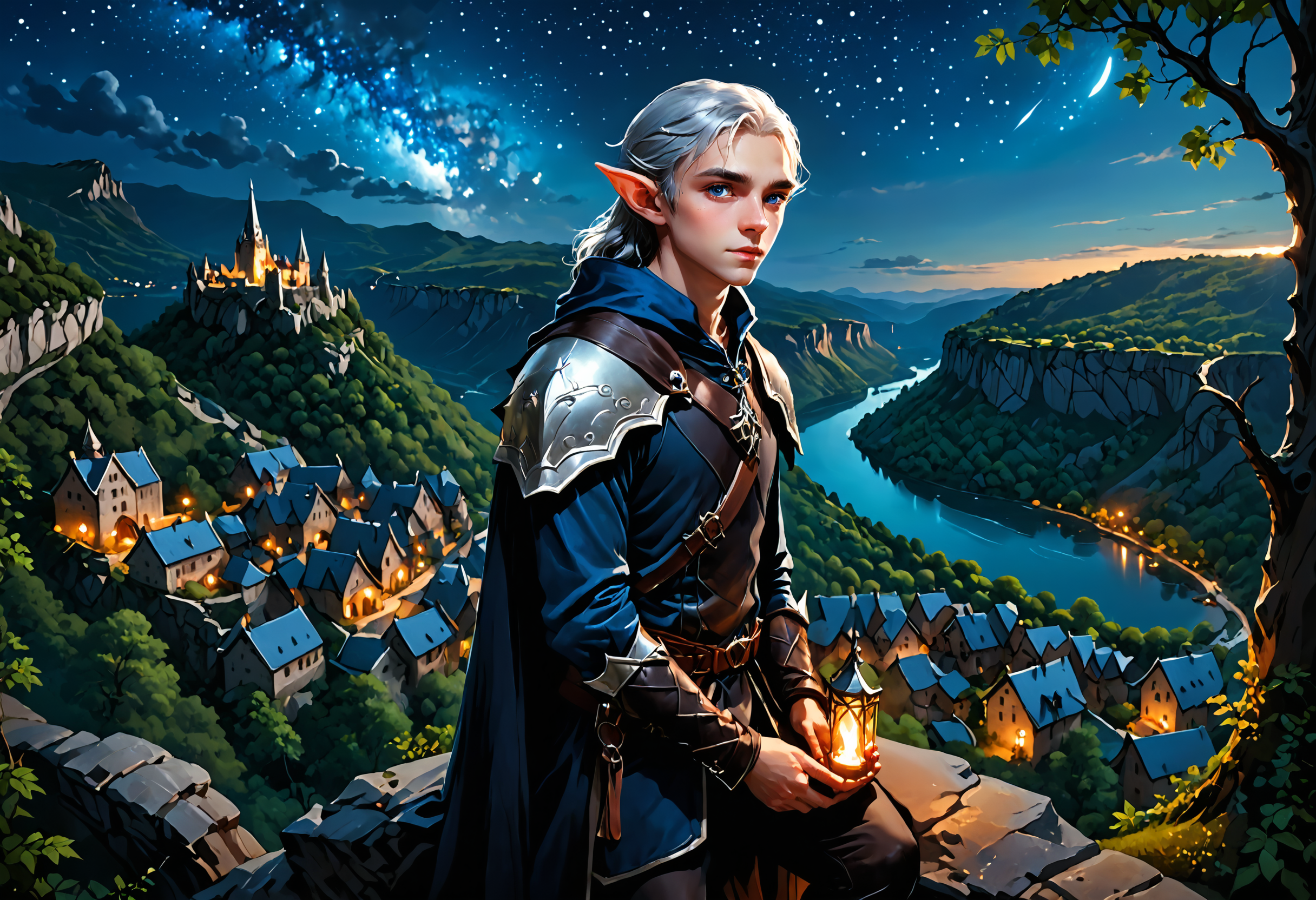 score_9,score_8_up,score_7_up,score_6_up, detailed, 4K, 1 boy , elf, age 22, pointy ears, long silver hair, brilliant blue eyes, dark clothes, sitting on a prominent cliff edge, facing viewer, overlooking a canyon with a river, stone archways over river, distant white towered elvish city in a forest, wearing dark leather armor, cloak, holding a magical glowing sword, bow on back, view from above, (fisheye lens:1.1), night, dramatic night sky, dramatic lighting, <lora:xl_more_art-full_v1:.7>, <lora:Half-Elves:1>