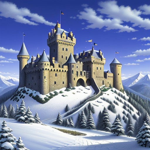 mountain castle, in ice and snow, fortified but comforting, on top of a mighty mountain in large mountain range, great bridges connect the castle to other towers on other mountains forming a great castle network
